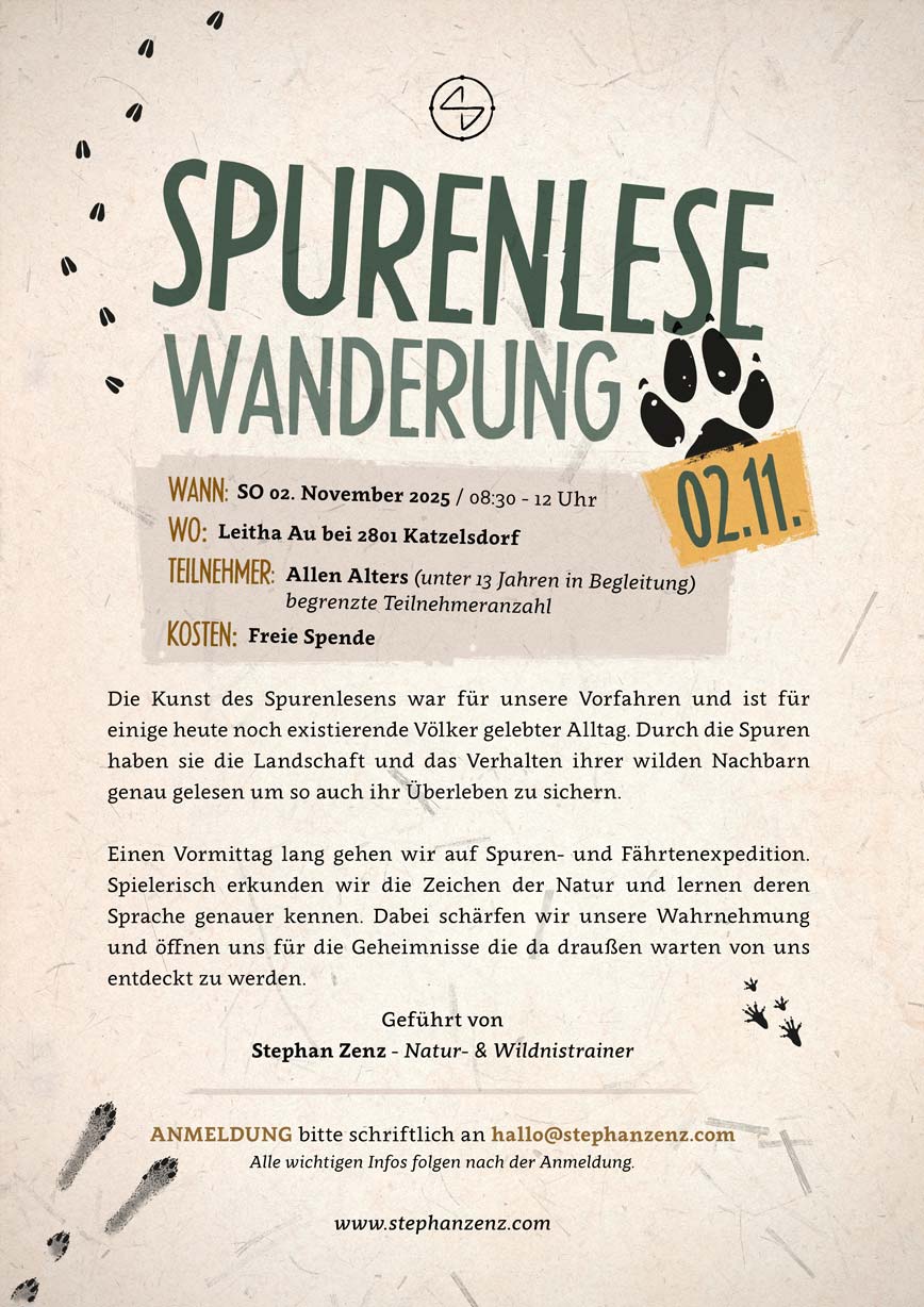 Die Kunst des Spurenlesens war für unsere Vorfahren und ist für einige heute noch existierende Völker gelebter Alltag. Durch die Spuren haben sie die Landschaft und das Verhalten ihrer wilden Nachbarn genau gelesen um so auch ihr Überleben zu sichern.