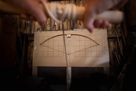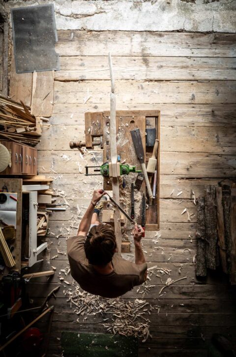 In vielen Schritten wird Schicht für Schicht der Bogen aus dem Holz herausgearbeitet. Beim Abtragen vom Groben ins Feine entsteht ein meditativer Fokus wo man mit dem Holz verschmilzt. Immer tiefer und feiner geht der Blick und man lernt den Charakter des Holzes genau kennen. Es entsteht eine greifbare Verbindung. Jeder Bogen ist ein Unikat, sowie auch jeder Baum individuell aufgrund seiner unterschiedlichen Einflüsse gewachsen ist und damit seine Lebensgeschichte mitbringt. Der Bogen ist letztlich schon im Holz, er will nur rausgearbeitet werden …